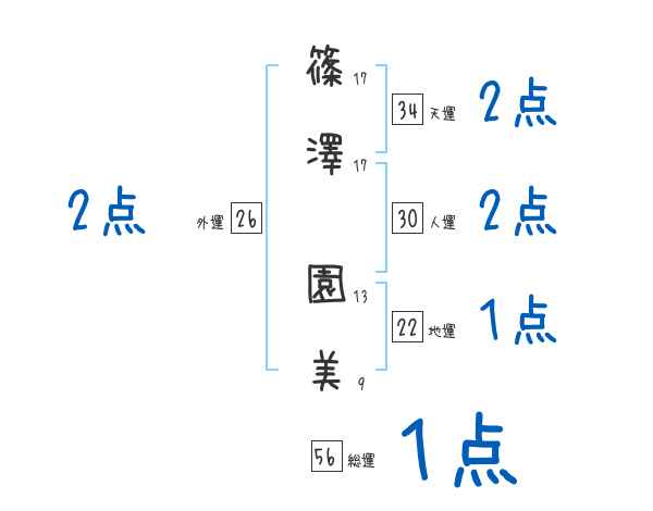 外運![]() | 篠澤園美さんの外運は26画の2つ星!波瀾万丈かも。信頼できる人を大事にしましょう。 生活面を象徴する運勢です。外部から受ける影響力を表し、結婚運、家庭運や職場、環境への順応性を表します。 |