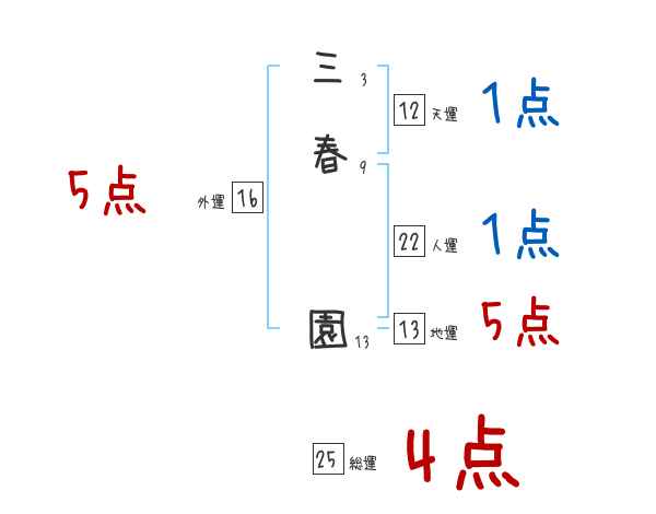 天運![]() | 三春園さんの天運は12画の1つ星!簡単な失敗で諦めてしまいやすいかも。着実に行動すると良いでしょう。 家系が持つ宿命的な運勢を表します。祖先から受け継いだ苗字ですので自分の力が及びません。家柄を象徴します。 |