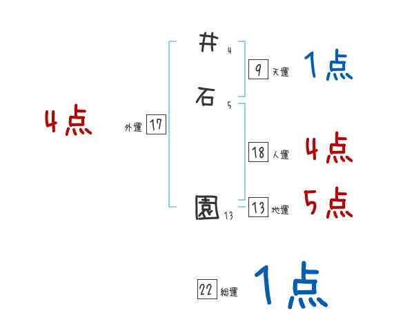 天運![]() | 井石園さんの天運は9画の1つ星!消極的で才能を発揮することが苦手なことも。周りの意見に耳を傾けましょう。 家系が持つ宿命的な運勢を表します。祖先から受け継いだ苗字ですので自分の力が及びません。家柄を象徴します。 |