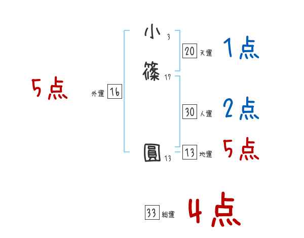 外運![]() | 小篠圓さんの外運は16画の5つ星!人望が厚く大きく発展する。逆転成功が見える。 生活面を象徴する運勢です。外部から受ける影響力を表し、結婚運、家庭運や職場、環境への順応性を表します。 |