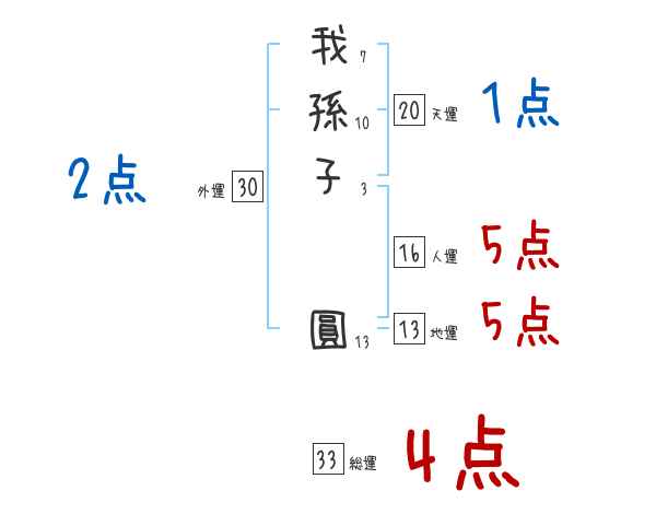 人運![]() | 我孫子圓さんの人運は16画の5つ星!人望が厚く大きく発展する。逆転成功が見える。 性格や才能などを表す2番目に重要な運勢です。人間関係や協調性、社会的な成功に影響します。主に20歳から50歳ぐらいまでの中年期の運勢を表します。 |