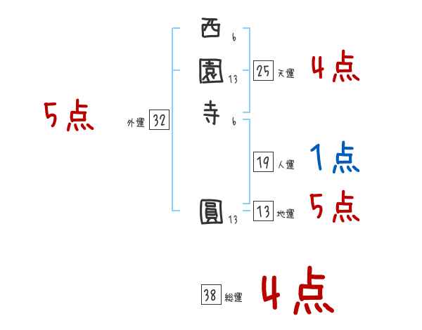 外運![]() | 西園寺圓さんの外運は32画の5つ星!柔軟性があり成功する。チャンスが多く金運が良い。 生活面を象徴する運勢です。外部から受ける影響力を表し、結婚運、家庭運や職場、環境への順応性を表します。 |