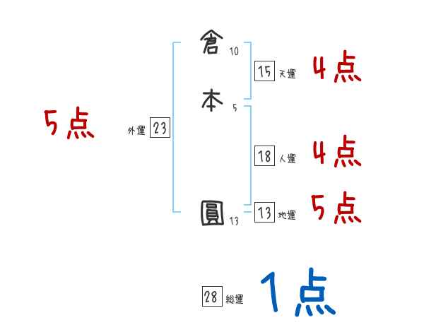 総運![]() | 倉本圓さんの総運は28画の1つ星!家庭環境に注意。スポーツで活躍できる能力があるかも。 あなたの人生を表す1番重要な運勢です。生涯を通じて影響する総合運となり、主に50歳以降の晩年期に影響を及ぼします。 |