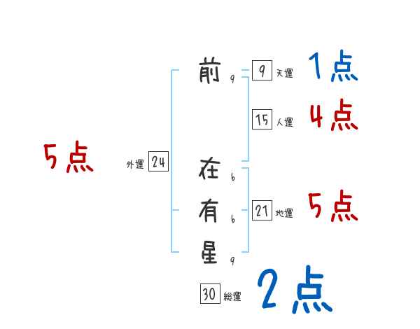 外運![]() | 前在有星さんの外運は24画の5つ星!家庭運が良く順調な人生。金運にも恵まれる。 生活面を象徴する運勢です。外部から受ける影響力を表し、結婚運、家庭運や職場、環境への順応性を表します。 |