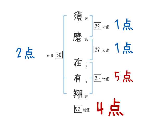 天運![]() | 須磨在有翔さんの天運は28画の1つ星!家庭環境に注意。スポーツで活躍できる能力があるかも。 家系が持つ宿命的な運勢を表します。祖先から受け継いだ苗字ですので自分の力が及びません。家柄を象徴します。 |