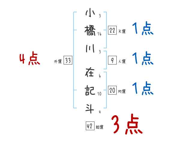 外運![]() | 小橋川在記斗さんの外運は33画の4つ星!権力志向でプライドが高い。勇気があり運を切り開き成功する。 生活面を象徴する運勢です。外部から受ける影響力を表し、結婚運、家庭運や職場、環境への順応性を表します。 |