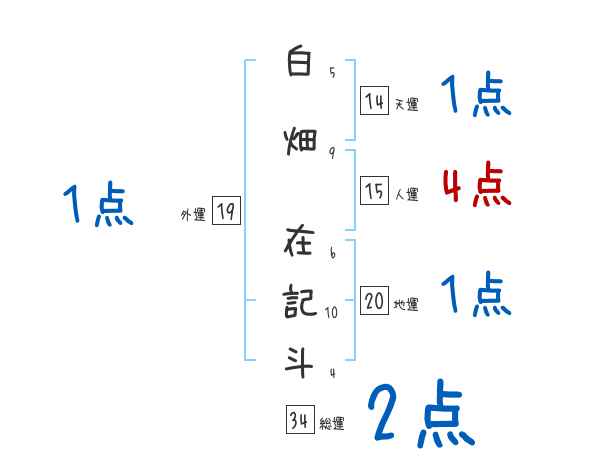 総運![]() | 白畑在記斗さんの総運は34画の2つ星!独創性に優れるが、自尊心が強く災難に注意しましょう。 あなたの人生を表す1番重要な運勢です。生涯を通じて影響する総合運となり、主に50歳以降の晩年期に影響を及ぼします。 |