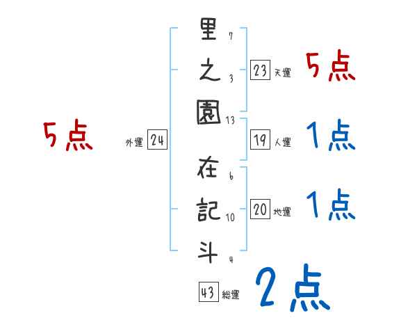 外運![]() | 里之園在記斗さんの外運は24画の5つ星!家庭運が良く順調な人生。金運にも恵まれる。 生活面を象徴する運勢です。外部から受ける影響力を表し、結婚運、家庭運や職場、環境への順応性を表します。 |
