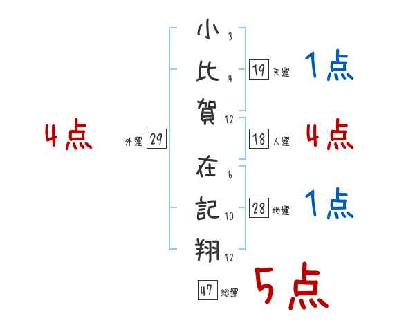 総運![]() | 小比賀在記翔さんの総運は47画の5つ星!実力が開花し発展する円満な人生。財に恵まれる。 あなたの人生を表す1番重要な運勢です。生涯を通じて影響する総合運となり、主に50歳以降の晩年期に影響を及ぼします。 |
