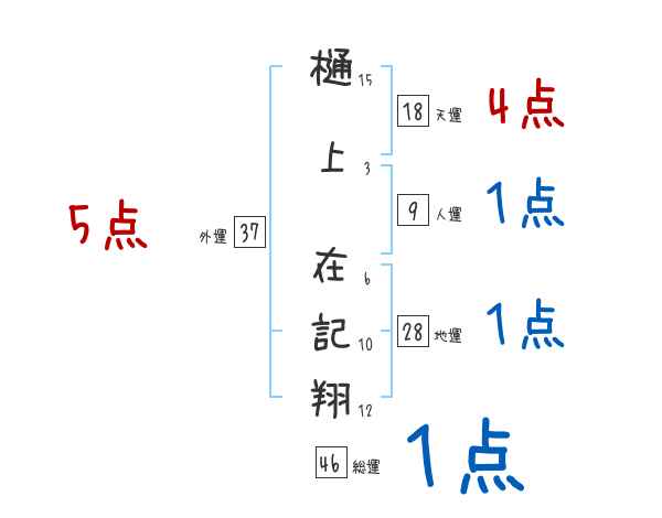 天運![]() | 樋上在記翔さんの天運は18画の4つ星!情熱的で剛気。忍耐力があり信頼される。 家系が持つ宿命的な運勢を表します。祖先から受け継いだ苗字ですので自分の力が及びません。家柄を象徴します。 |