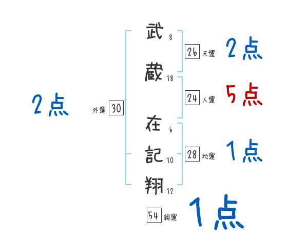 天運![]() | 武蔵在記翔さんの天運は26画の2つ星!波瀾万丈かも。信頼できる人を大事にしましょう。 家系が持つ宿命的な運勢を表します。祖先から受け継いだ苗字ですので自分の力が及びません。家柄を象徴します。 |