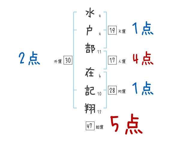 総運![]() | 水戸部在記翔さんの総運は47画の5つ星!実力が開花し発展する円満な人生。財に恵まれる。 あなたの人生を表す1番重要な運勢です。生涯を通じて影響する総合運となり、主に50歳以降の晩年期に影響を及ぼします。 |