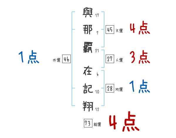 総運![]() | 與那覇在記翔さんの総運は73画の4つ星!天徳のある人生。散財に注意すれば晩年幸福。 あなたの人生を表す1番重要な運勢です。生涯を通じて影響する総合運となり、主に50歳以降の晩年期に影響を及ぼします。 |