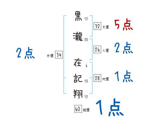 天運![]() | 黒瀧在記翔さんの天運は32画の5つ星!柔軟性があり成功する。チャンスが多く金運が良い。 家系が持つ宿命的な運勢を表します。祖先から受け継いだ苗字ですので自分の力が及びません。家柄を象徴します。 |
