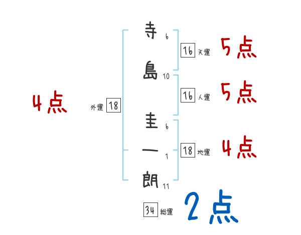 総運![]() | 寺島圭一朗さんの総運は34画の2つ星!独創性に優れるが、自尊心が強く災難に注意しましょう。 あなたの人生を表す1番重要な運勢です。生涯を通じて影響する総合運となり、主に50歳以降の晩年期に影響を及ぼします。 |