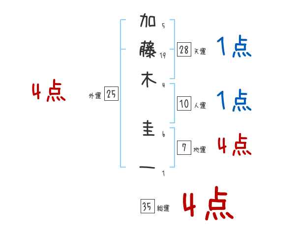 地運![]() | 加藤木圭一さんの地運は7画の4つ星!強い意志や信念を持ち独立心が強い。自立する。 個性を表す基礎的な運勢です。性格形成や対人関係、行動力など家庭環境に影響されます。主に誕生してから20歳くらいまでの若年期の運勢を表します。 |