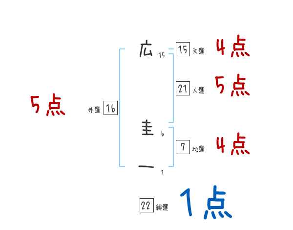 外運![]() | 広圭一さんの外運は16画の5つ星!人望が厚く大きく発展する。逆転成功が見える。 生活面を象徴する運勢です。外部から受ける影響力を表し、結婚運、家庭運や職場、環境への順応性を表します。 |