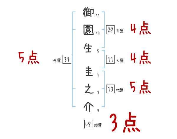 総運![]() | 御園生圭之介さんの総運は42画の3つ星!病気に注意。多芸であるが消極的でおとなしい。 あなたの人生を表す1番重要な運勢です。生涯を通じて影響する総合運となり、主に50歳以降の晩年期に影響を及ぼします。 |