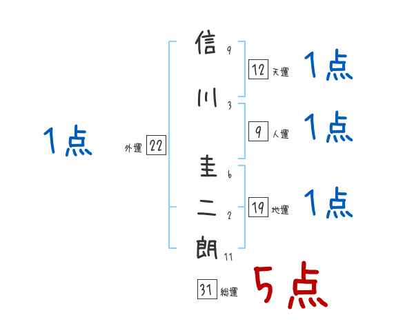 外運![]() | 信川圭二朗さんの外運は22画の1つ星!努力することが苦手ないっぽう手先が器用。芸術性にも優れる。 生活面を象徴する運勢です。外部から受ける影響力を表し、結婚運、家庭運や職場、環境への順応性を表します。 |
