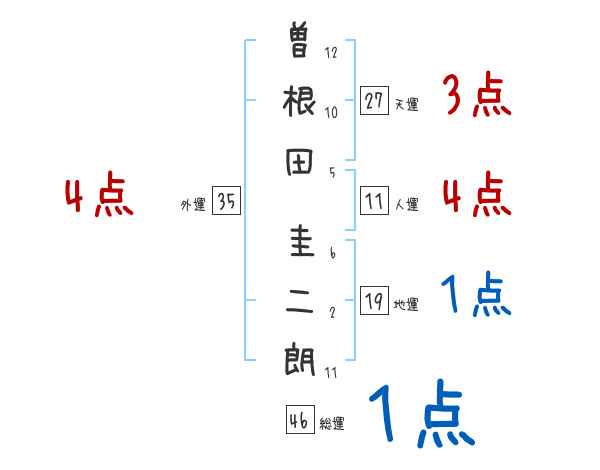 天運![]() | 曽根田圭二朗さんの天運は27画の3つ星!頭脳明晰だが強情で摩擦が多い傾向。孤立に注意。 家系が持つ宿命的な運勢を表します。祖先から受け継いだ苗字ですので自分の力が及びません。家柄を象徴します。 |
