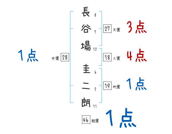 天運![]() | 長谷場圭二朗さんの天運は27画の3つ星!頭脳明晰だが強情で摩擦が多い傾向。孤立に注意。 家系が持つ宿命的な運勢を表します。祖先から受け継いだ苗字ですので自分の力が及びません。家柄を象徴します。 |