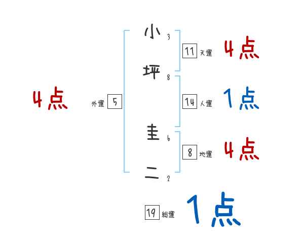 天運![]() | 小坪圭二さんの天運は11画の4つ星!着実に富や地位を得る幸運な人生。 家系が持つ宿命的な運勢を表します。祖先から受け継いだ苗字ですので自分の力が及びません。家柄を象徴します。 |