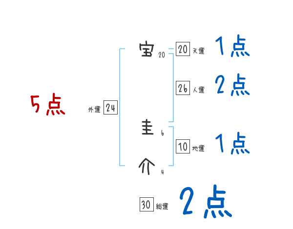 外運![]() | 宝圭介さんの外運は24画の5つ星!家庭運が良く順調な人生。金運にも恵まれる。 生活面を象徴する運勢です。外部から受ける影響力を表し、結婚運、家庭運や職場、環境への順応性を表します。 |