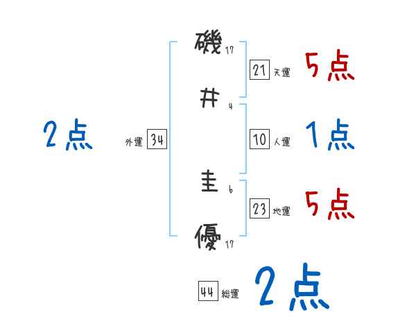 天運![]() | 磯井圭優さんの天運は21画の5つ星!統率力がある。独立し成功する。名誉を手に入れる。 家系が持つ宿命的な運勢を表します。祖先から受け継いだ苗字ですので自分の力が及びません。家柄を象徴します。 |