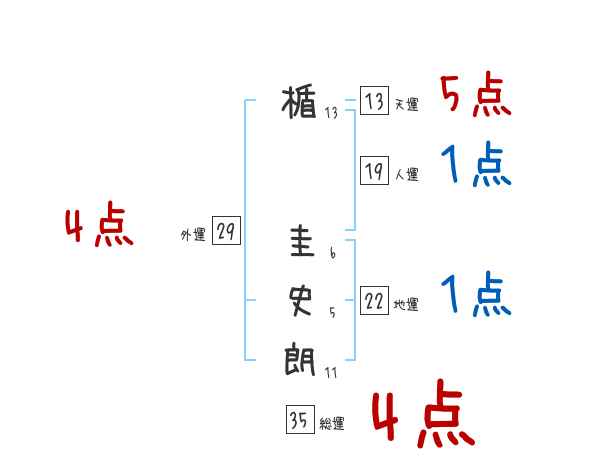 外運![]() | 楯圭史朗さんの外運は29画の4つ星!完全主義で才能がある。厳格な心の持ち主。 生活面を象徴する運勢です。外部から受ける影響力を表し、結婚運、家庭運や職場、環境への順応性を表します。 |
