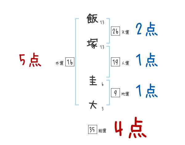 外運![]() | 飯塚圭大さんの外運は16画の5つ星!人望が厚く大きく発展する。逆転成功が見える。 生活面を象徴する運勢です。外部から受ける影響力を表し、結婚運、家庭運や職場、環境への順応性を表します。 |
