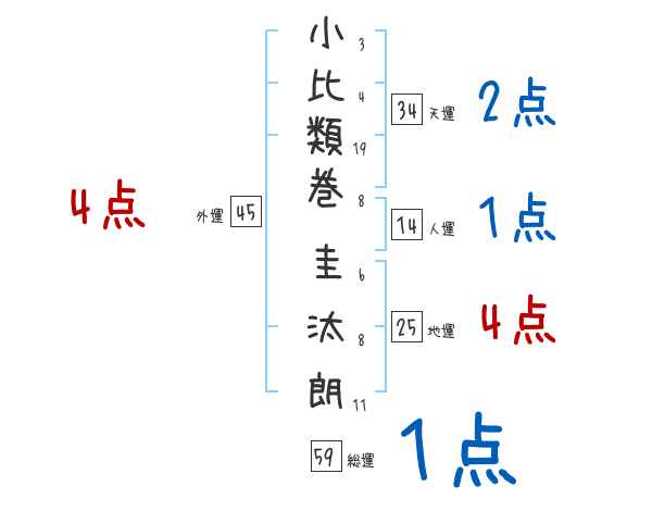 天運![]() | 小比類巻圭汰朗さんの天運は34画の2つ星!独創性に優れるが、自尊心が強く災難に注意しましょう。 家系が持つ宿命的な運勢を表します。祖先から受け継いだ苗字ですので自分の力が及びません。家柄を象徴します。 |