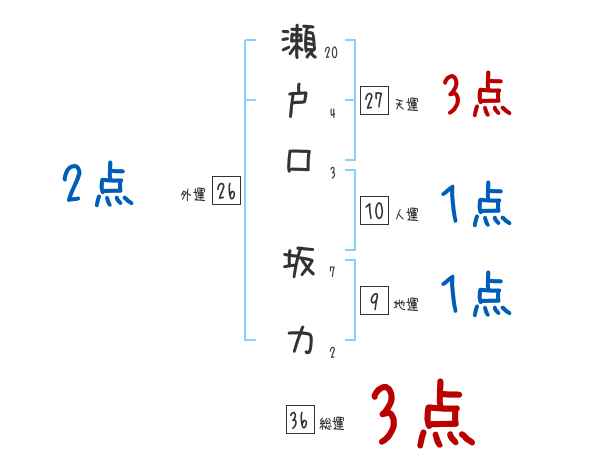 総運![]() | 瀬戸口坂力さんの総運は36画の3つ星!先見性が豊かです。多少神経質で苦労することも。 あなたの人生を表す1番重要な運勢です。生涯を通じて影響する総合運となり、主に50歳以降の晩年期に影響を及ぼします。 |