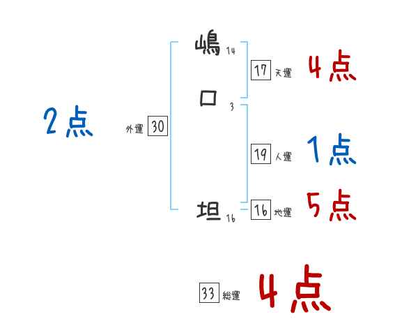 外運![]() | 嶋口坦さんの外運は30画の2つ星!浮き沈みの激しさに注意しましょう。 生活面を象徴する運勢です。外部から受ける影響力を表し、結婚運、家庭運や職場、環境への順応性を表します。 |