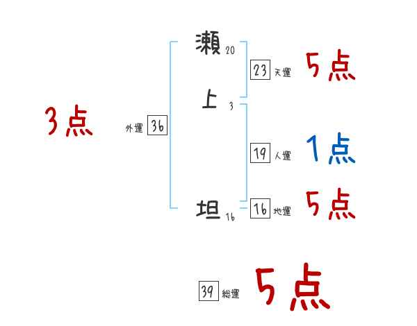 外運![]() | 瀬上坦さんの外運は36画の3つ星!先見性が豊かです。多少神経質で苦労することも。 生活面を象徴する運勢です。外部から受ける影響力を表し、結婚運、家庭運や職場、環境への順応性を表します。 |
