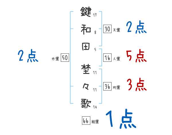 外運![]() | 鍵和田埜々歌さんの外運は50画の2つ星!浮き沈みが激しく不安定。しりすぼみに衰退しやすいので注意しましょう。 生活面を象徴する運勢です。外部から受ける影響力を表し、結婚運、家庭運や職場、環境への順応性を表します。 |
