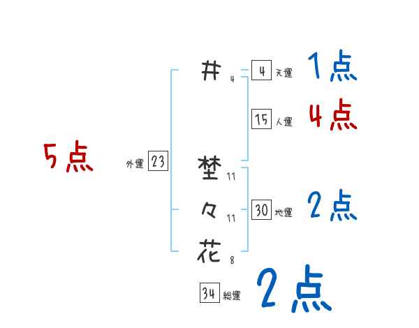 天運![]() | 井埜々花さんの天運は4画の1つ星!感情が不安定で苦労するかも。周囲との協調を心掛けましょう。 家系が持つ宿命的な運勢を表します。祖先から受け継いだ苗字ですので自分の力が及びません。家柄を象徴します。 |