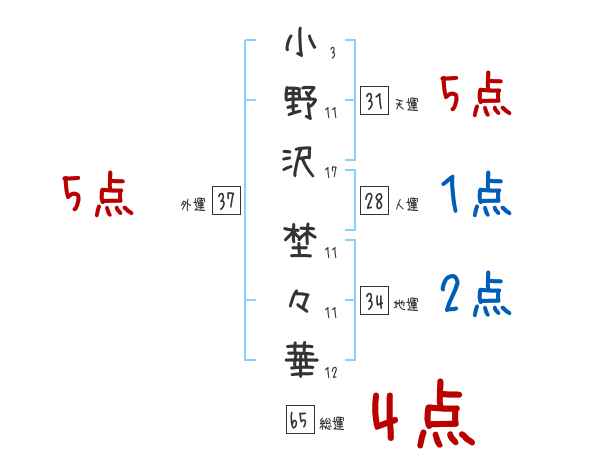 総運![]() | 小野沢埜々華さんの総運は65画の4つ星!幸運に恵まれ繁栄する。包容力がある。 あなたの人生を表す1番重要な運勢です。生涯を通じて影響する総合運となり、主に50歳以降の晩年期に影響を及ぼします。 |