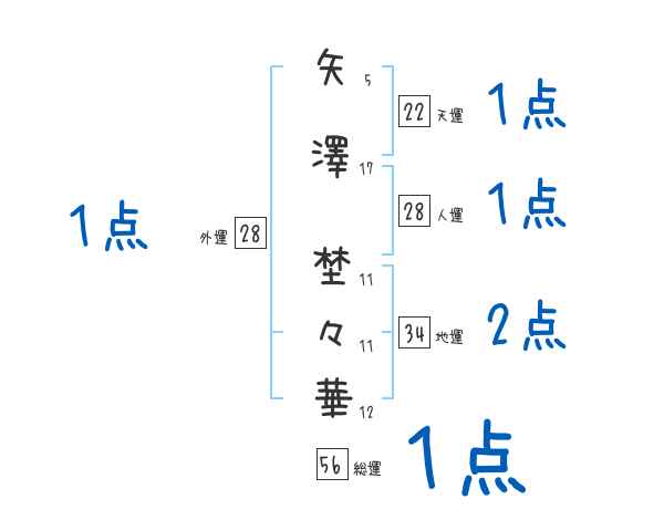 天運![]() | 矢澤埜々華さんの天運は22画の1つ星!努力することが苦手ないっぽう手先が器用。芸術性にも優れる。 家系が持つ宿命的な運勢を表します。祖先から受け継いだ苗字ですので自分の力が及びません。家柄を象徴します。 |