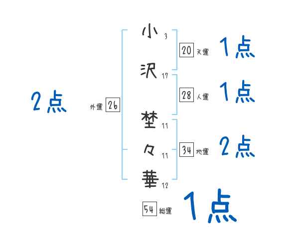 外運![]() | 小沢埜々華さんの外運は26画の2つ星!波瀾万丈かも。信頼できる人を大事にしましょう。 生活面を象徴する運勢です。外部から受ける影響力を表し、結婚運、家庭運や職場、環境への順応性を表します。 |