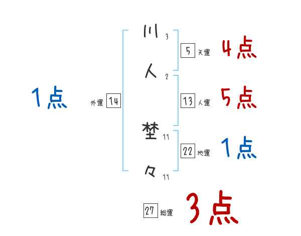 天運![]() | 川人埜々さんの天運は5画の4つ星!健康で安泰。協調性に優れ、財産に恵まれる。 家系が持つ宿命的な運勢を表します。祖先から受け継いだ苗字ですので自分の力が及びません。家柄を象徴します。 |
