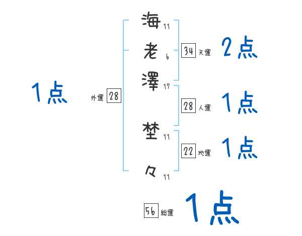 地運![]() | 海老澤埜々さんの地運は22画の1つ星!努力することが苦手ないっぽう手先が器用。芸術性にも優れる。 個性を表す基礎的な運勢です。性格形成や対人関係、行動力など家庭環境に影響されます。主に誕生してから20歳くらいまでの若年期の運勢を表します。 |