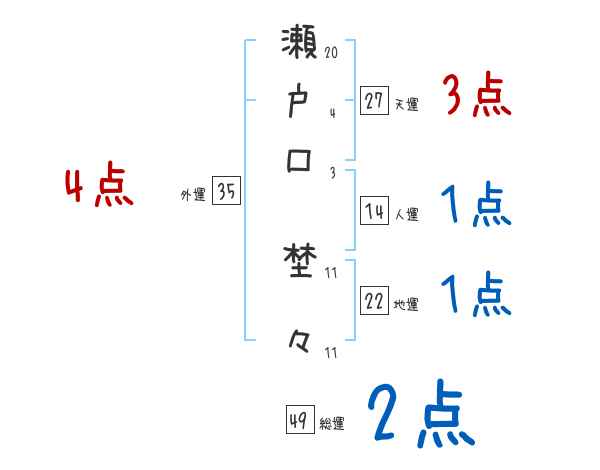 外運![]() | 瀬戸口埜々さんの外運は35画の4つ星!温厚な性格で感受性が高い。穏和な性格で人望が厚い。 生活面を象徴する運勢です。外部から受ける影響力を表し、結婚運、家庭運や職場、環境への順応性を表します。 |