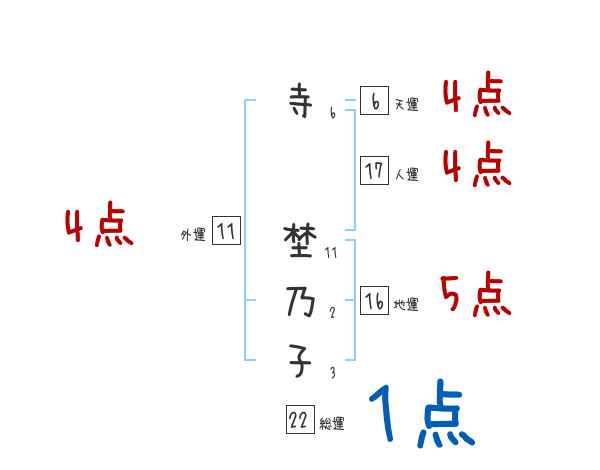 天運![]() | 寺埜乃子さんの天運は6画の4つ星!慎重な努力家で信頼を得る。誠実な精神で向上心に優れる。 家系が持つ宿命的な運勢を表します。祖先から受け継いだ苗字ですので自分の力が及びません。家柄を象徴します。 |
