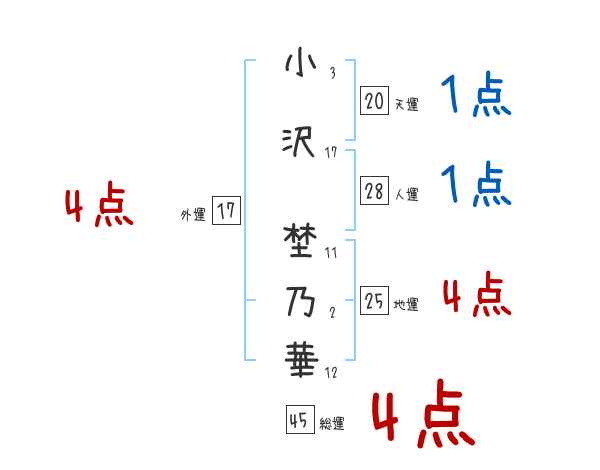 外運![]() | 小沢埜乃華さんの外運は17画の4つ星!積極的な行動力。地位を気づき財産を手に入れる。純粋な心と直感力。 生活面を象徴する運勢です。外部から受ける影響力を表し、結婚運、家庭運や職場、環境への順応性を表します。 |