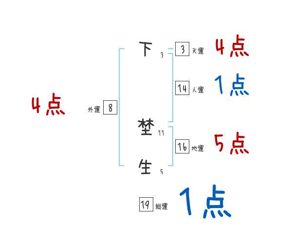 天運![]() | 下埜生さんの天運は3画の4つ星!活動的で才能に恵まれ、多くの信頼を得る。希望に満ち成長する。 家系が持つ宿命的な運勢を表します。祖先から受け継いだ苗字ですので自分の力が及びません。家柄を象徴します。 |