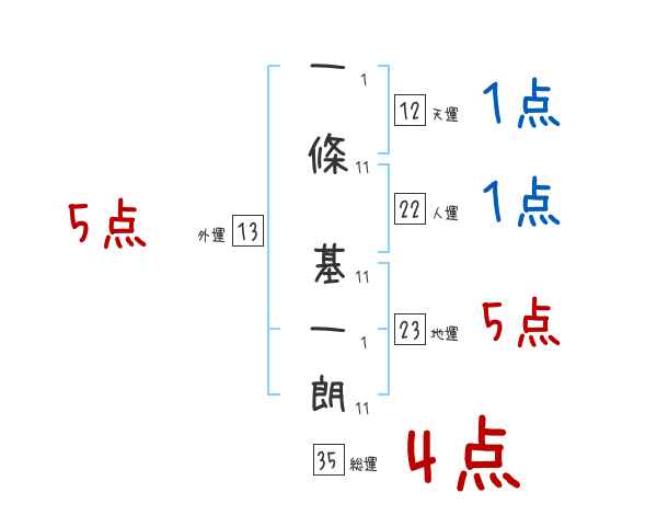 総運![]() | 一條基一朗さんの総運は35画の4つ星!温厚な性格で感受性が高い。穏和な性格で人望が厚い。 あなたの人生を表す1番重要な運勢です。生涯を通じて影響する総合運となり、主に50歳以降の晩年期に影響を及ぼします。 |