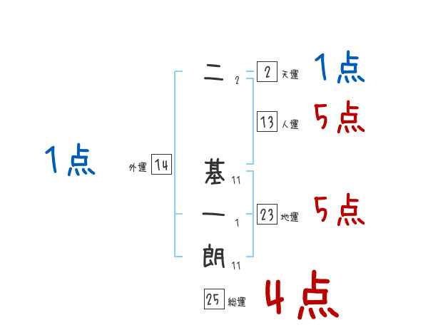 外運![]() | 二基一朗さんの外運は14画の1つ星!人に対して優しいがストレスを溜め込みがち。人間関係のトラブルを避けるよう気をつけましょう。 生活面を象徴する運勢です。外部から受ける影響力を表し、結婚運、家庭運や職場、環境への順応性を表します。 |
