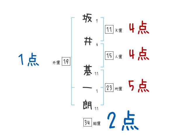天運![]() | 坂井基一朗さんの天運は11画の4つ星!着実に富や地位を得る幸運な人生。 家系が持つ宿命的な運勢を表します。祖先から受け継いだ苗字ですので自分の力が及びません。家柄を象徴します。 |