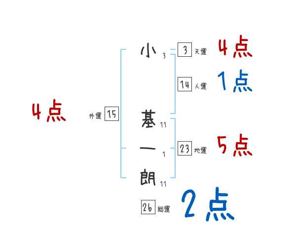 天運![]() | 小基一朗さんの天運は3画の4つ星!活動的で才能に恵まれ、多くの信頼を得る。希望に満ち成長する。 家系が持つ宿命的な運勢を表します。祖先から受け継いだ苗字ですので自分の力が及びません。家柄を象徴します。 |