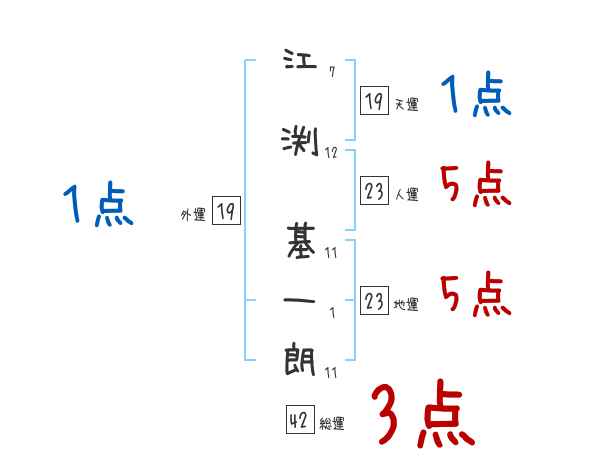 外運![]() | 江渕基一朗さんの外運は19画の1つ星!優れた才能を持ちますが、協調性が足りないことも。周りの人と協力する事を意識しましょう。 生活面を象徴する運勢です。外部から受ける影響力を表し、結婚運、家庭運や職場、環境への順応性を表します。 |